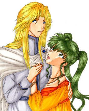 | 聖戦随一の身長差カップル(笑) クロード神父は聖職者なのに、剣士や騎士もビックリな身長180センチ↑ある人で す。シルヴィアは150センチちょっとくらいかな。もう少し高い方が踊り子として見栄 えがいいんでしょうけど、何となく小さな身体をいっぱいに使って踊っているという印 象があるので。寧ろ父親の遺伝で、娘のリーンの方が若干高いです(笑)160センチ くらいで。 クロードは聖職者なので、白が基調の衣装になりました。お陰で塗り易いような塗り 難いような…(^_^;)乗せられる色が限られてくるので。 逆にシルヴィアは、明るいオレンジ系で彩色。ジャラジャラつけてる首飾りやブレス レットは、本当は色んな原色の混ざった輝石を連ねたデザインのつもりで下描きし てたんですが、そのまま色を置いたらとてつもなくバランスが悪くなりそうだったの で渋い金色で塗ってます。 このカップルを語る時に避けては通れないのが『シルヴィアはクロードの妹か』… と言う問題ですが、多分そうなんだろうなと、ウチでは設定してます。但し異母兄妹 という事で。シルヴィアの系譜にブラギの光が灯っている以上、何らかの血縁関係 は在る筈なのですよ。もしかしたらただの遠縁の可能性もありますが、クロード自身 が行方不明になった妹の事を話題に出してますからねぇ…シルヴィアの髪の色か らも想像がつくように、彼女の生母はシレジア出身の女性と設定してます。異母兄 妹である事実と共に、ウチの創作で語る余地はありませんでしたが(^_^;) (シルヴィアの母はクロードの父の二番目の妻だった。先妻はクロードが幼少の頃 に病死) 2006/07/27 |